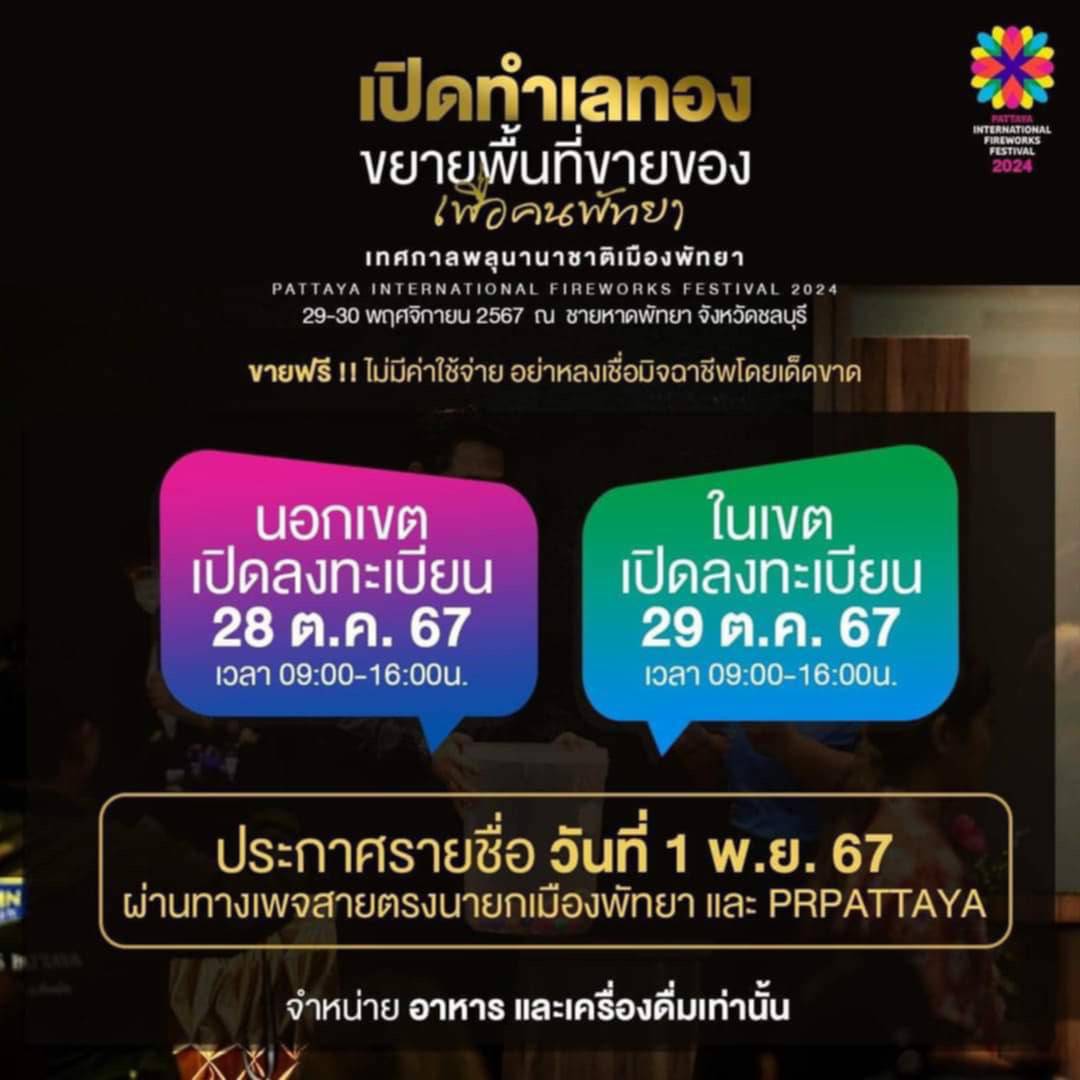 ขายฟรี หนึ่งในนโยบายเปิดทำเลทองขยายพื้นที่ขายของเพื่อคนพัทยา ในงานเทศกาลพลุนานาชาติเมืองพัทยา 2567 ในวันศุกร์ที่ 29 และวันเสาร์ที่ 30 พฤศจิกายน 2567 ณ ชายหาดพัทยา