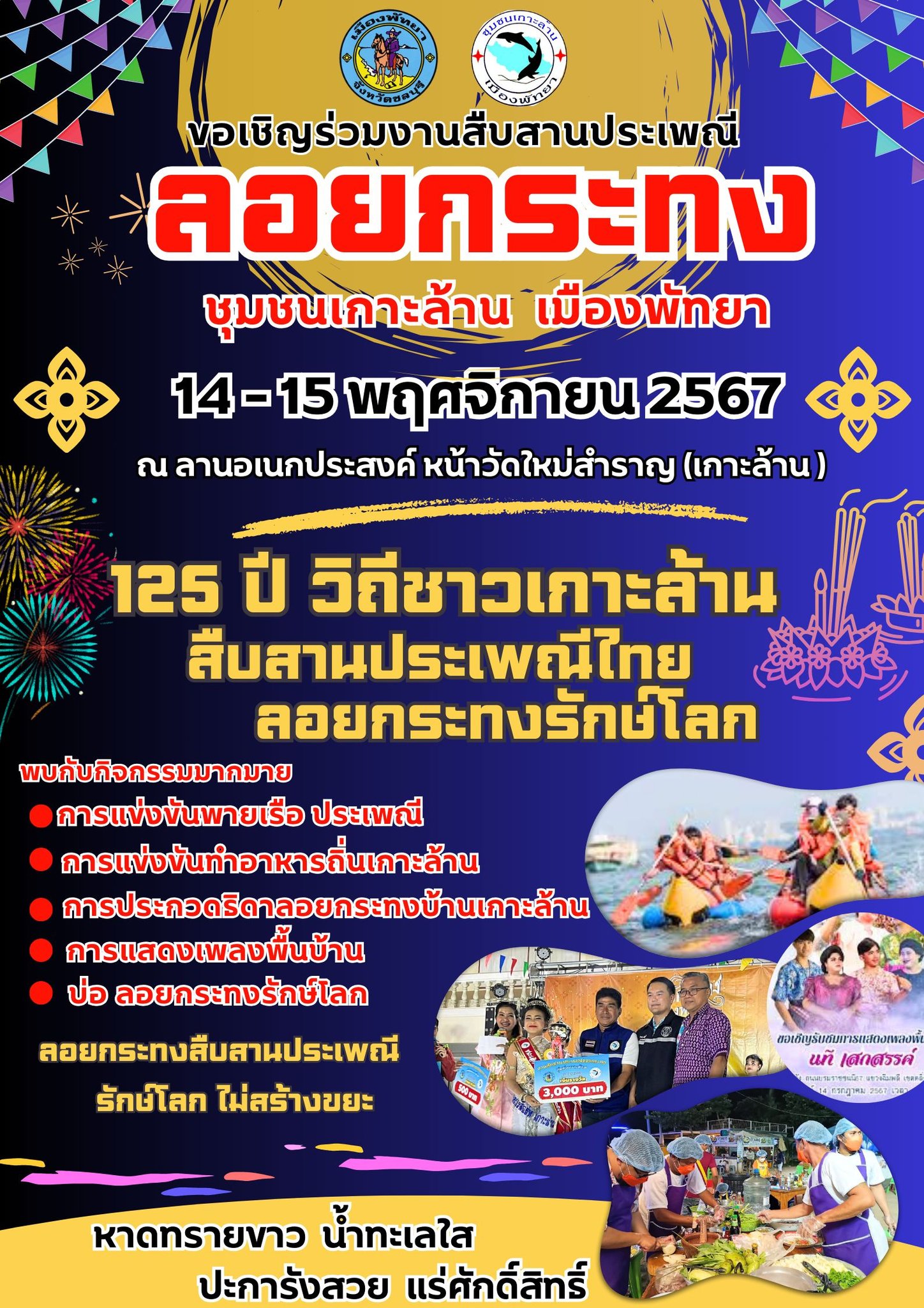 เตรียมตัวให้พร้อม! ร่วมสืบสานประเพณีไทยในงาน “สืบสานประเพณีลอยกระทง ชุมชนเกาะล้าน” ณ เมืองพัทยา ในวันที่ 14-15 พฤศจิกายน 2567 นี้ ที่ ลานอเนกประสงค์หน้าวัดใหม่สำราญ (วัดเกาะล้าน)