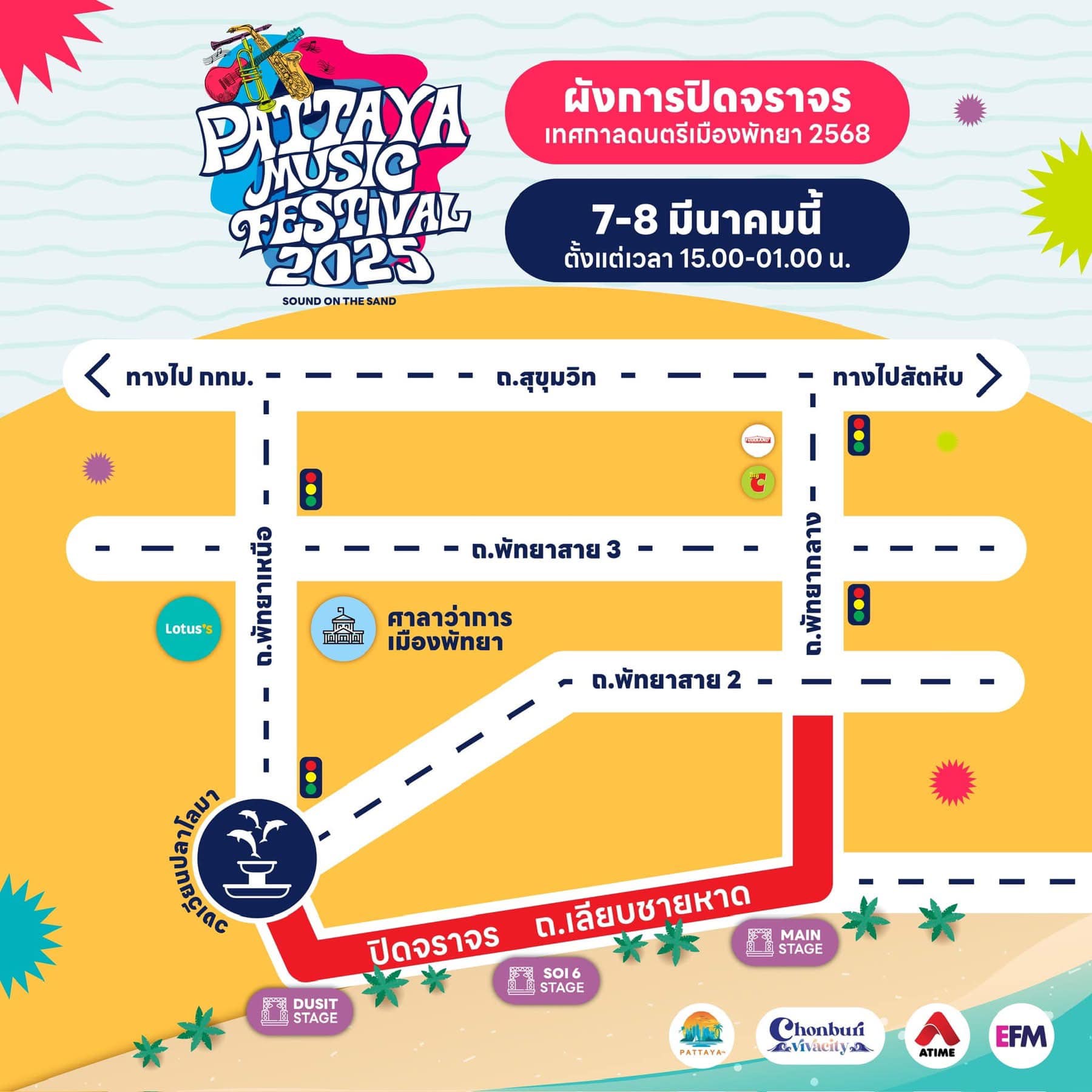 วันที่ 7-8 มีนาคม 2568 | 3 เวทีสุดมันส์ ณ ชายหาดพัทยา จุดปิดการจราจรและปรับเปลี่ยนเส้นทาง